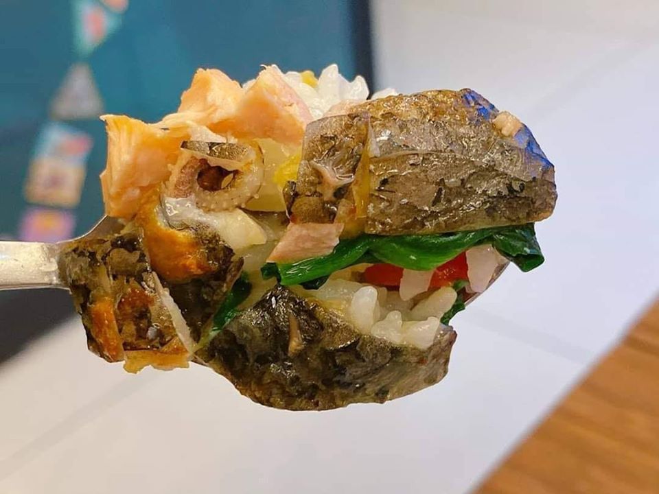 ▼網友在臉書上po文說:「為了讓小孩吃口飯還真是辛苦,老公說這是龍…他組裝了很久。」爸爸為了讓寶貝女兒吃飯,將魚肉、海鮮、高麗菜和白飯組裝起來,在湯匙上擺成了龍的模樣。這隻龍惟妙惟肖,讓人非常佩服。