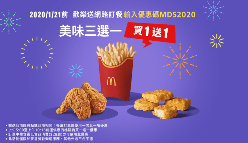 優惠內容:使用歡樂送網路訂餐,輸入優惠程式碼「MDS2020」就可享有大薯、四塊麥克雞塊、勁辣香雞翅3選1的「同品項買一送一」優惠。