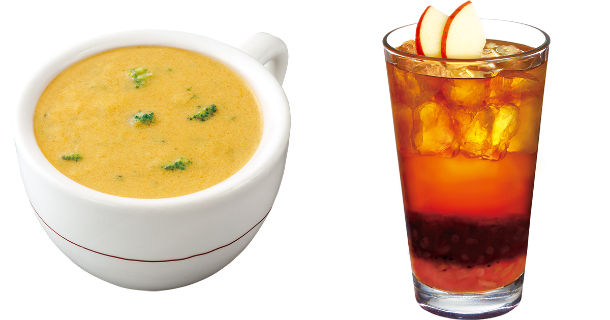 ▼另外,以金黃鹹鮮的鹹蛋黃入味的「金沙南瓜濃湯」,鹹甜鹹甜的滋味超溫暖~而「白桃蔓越莓冰茶」加入了來自加拿大、有北美紅寶石之稱的蔓越莓果凍,搭配果香濃郁的白桃醬,根本是夢幻飲品!