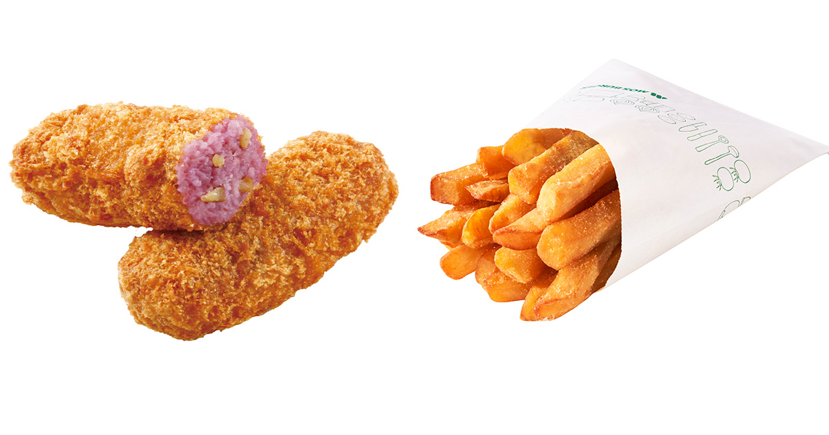 ▼除了雙雙蝦堡外,還有嚴選台灣在地台農57號番薯製成的「黃金地瓜薯」,鬆Q綿密、甜而不膩;而使用日本直送鹿兒島紫薯的「紫薯栗子可樂餅」,紫紫胖胖的樣子超勾錐,紫薯特有的香甜讓人吃了超滿足~