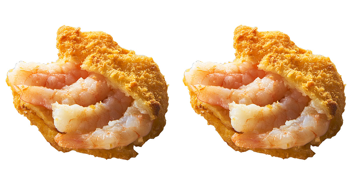 ▼雙雙蝦堡特別選用「2+2隻」完整的海水養殖白蝦,以手工排列後裹上薄薄的麵衣,下油鍋上色至金黃,口感爽脆鮮甜,每一口都可以吃到十足海味!