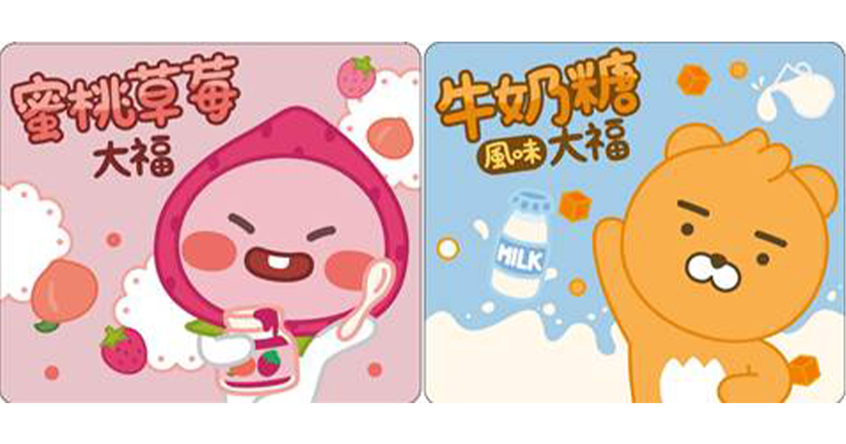 ▼此外,全家推出KAKAO療癒新品「蜜桃草莓大福」跟「牛奶糖風味大福」也將於1/15起跟第一波集點商品同步上市,分別以Ryan跟Apeach現身包裝上,沒吃到會捶心肝!