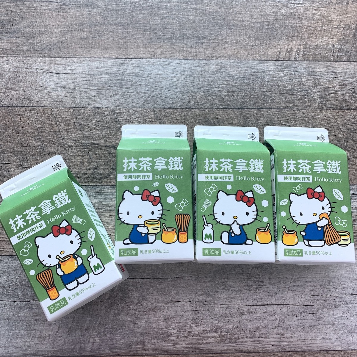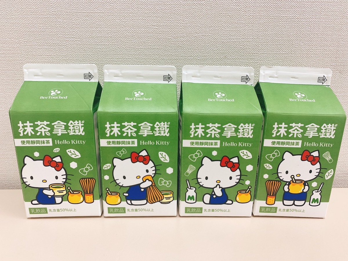 ▼「蜜蜂工坊-抹茶拿鐵」,包裝上的Hello Kitty正在拿起各種抹茶用具,製作抹茶、品嚐抹茶,4種不同的樣子都呆呆的,好萌啊!