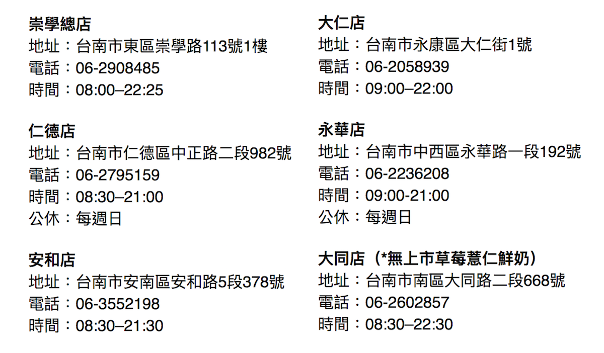 ▼雖然是在台南的飲料店,但是飲料都真的可以調整甜度,不用擔心會太甜啦XD;另外提醒想去喝季節限定「草莓薏仁鮮奶」的人,這款飲品每日限量,並且只在崇學總店、仁德店、安和店、大仁店、永華店五間門市才有喔,千萬不要撲空了!想要看菜單、更多詳細新品資訊,也可以到第一站的Facebook上查詢。