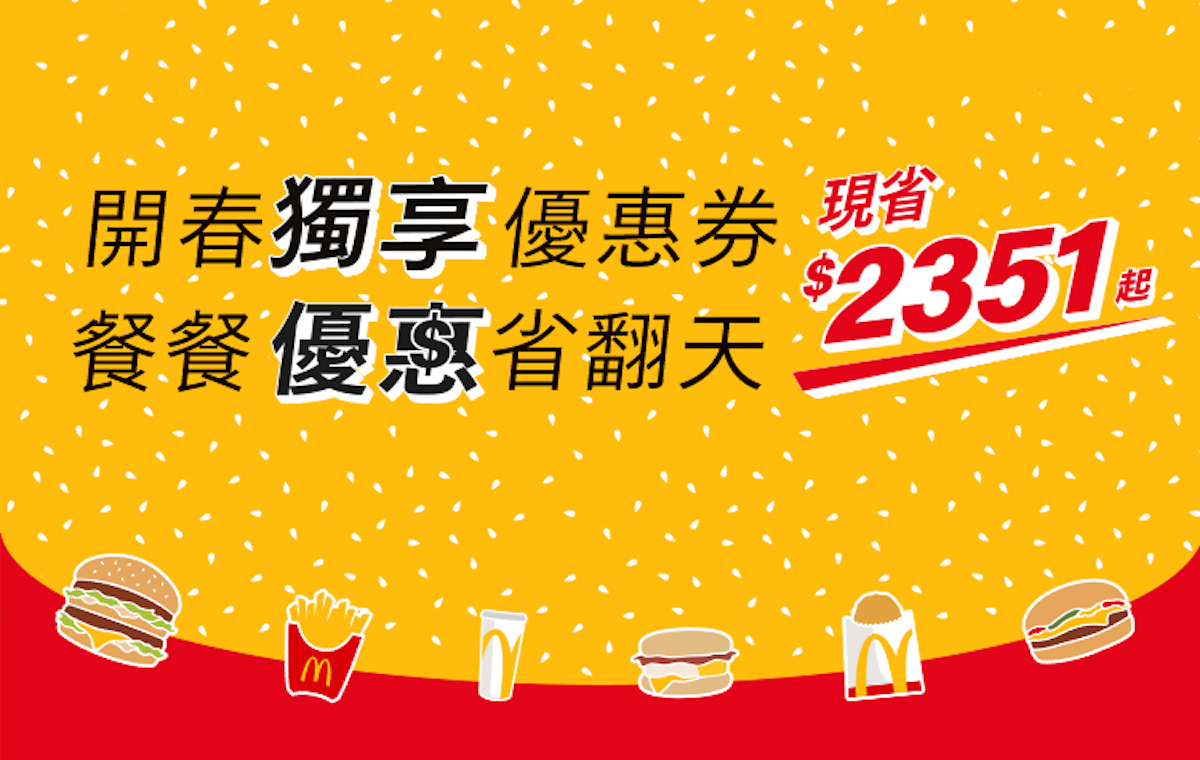 ▼台灣麥當勞自1/31起至3/5推出「開春獨享優惠券」,消費者結帳時於櫃枱出示優惠券紙本或手機畫面,就可享有優惠折扣;要是每一個優惠都有換到,直接省下2351元!