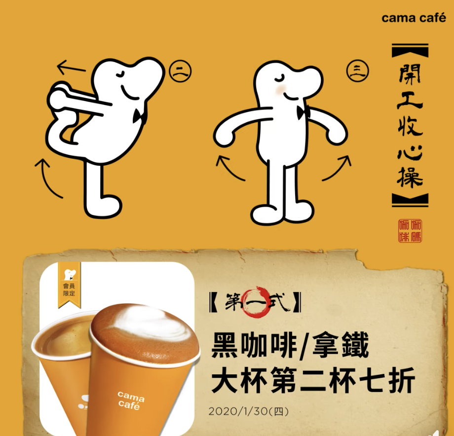 ▼開工日cama café也祭出app會員黑咖啡、拿鐵大杯第二杯七折的優惠,新的一年陪大家繼續向~前~衝!