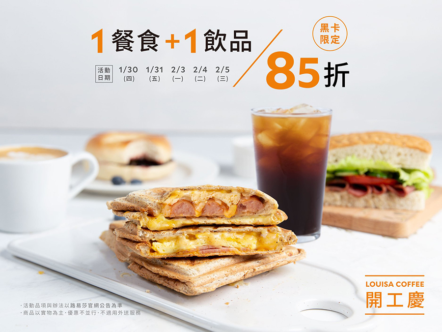 ▼路易莎新春開工大吉,只要在1/30(四)、1/31(五)、2/3(一)、2/4(二)、2/5(三) 限定五天,點餐前出示黑卡即享「餐點優惠」,任1餐食+任1杯飲品的總金額85折優惠。