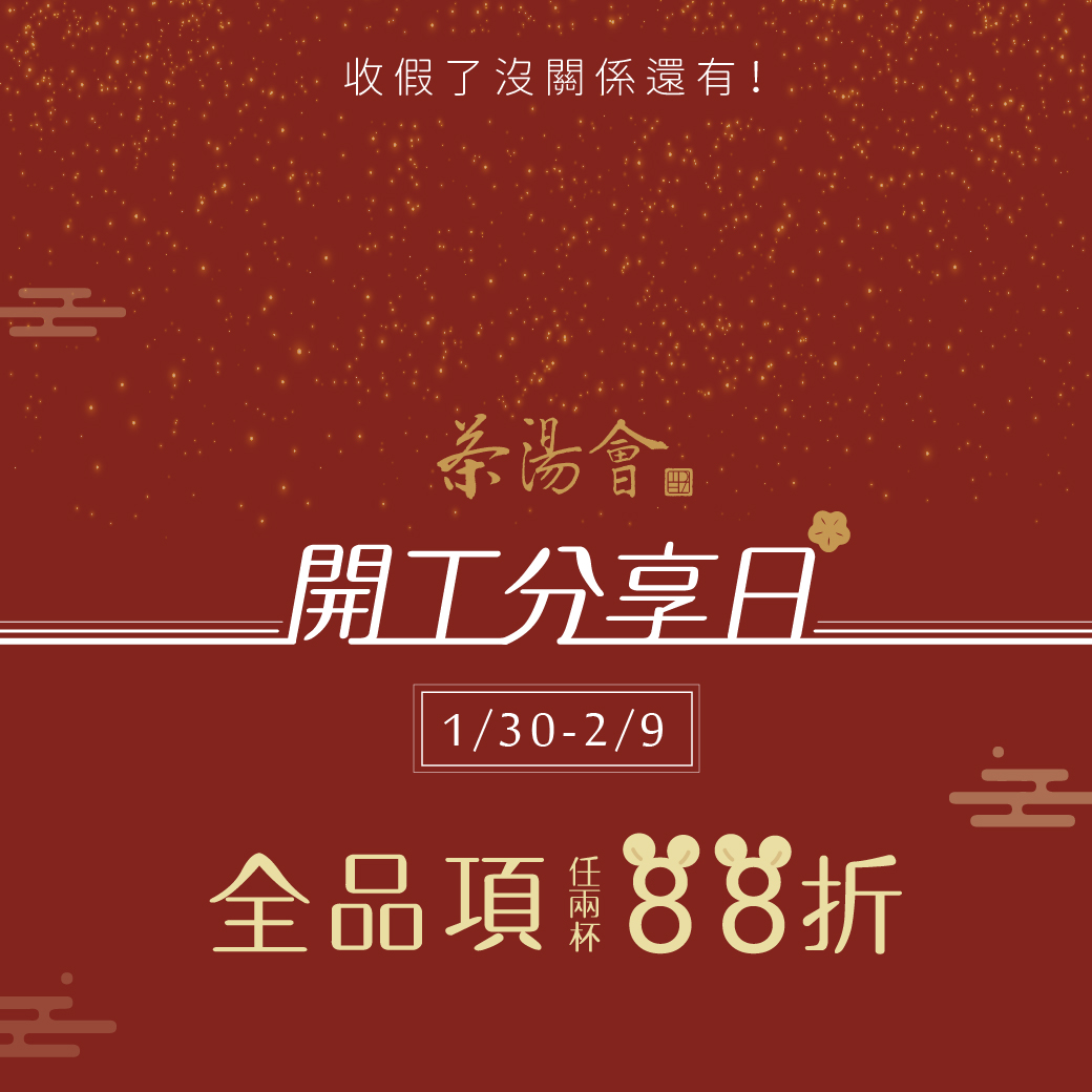 ▼收假了沒關係,茶湯會推出「開工分享日」活動,於1/30~2/9期間至全台門市購買飲品,全品項任選2杯即享88折優惠。