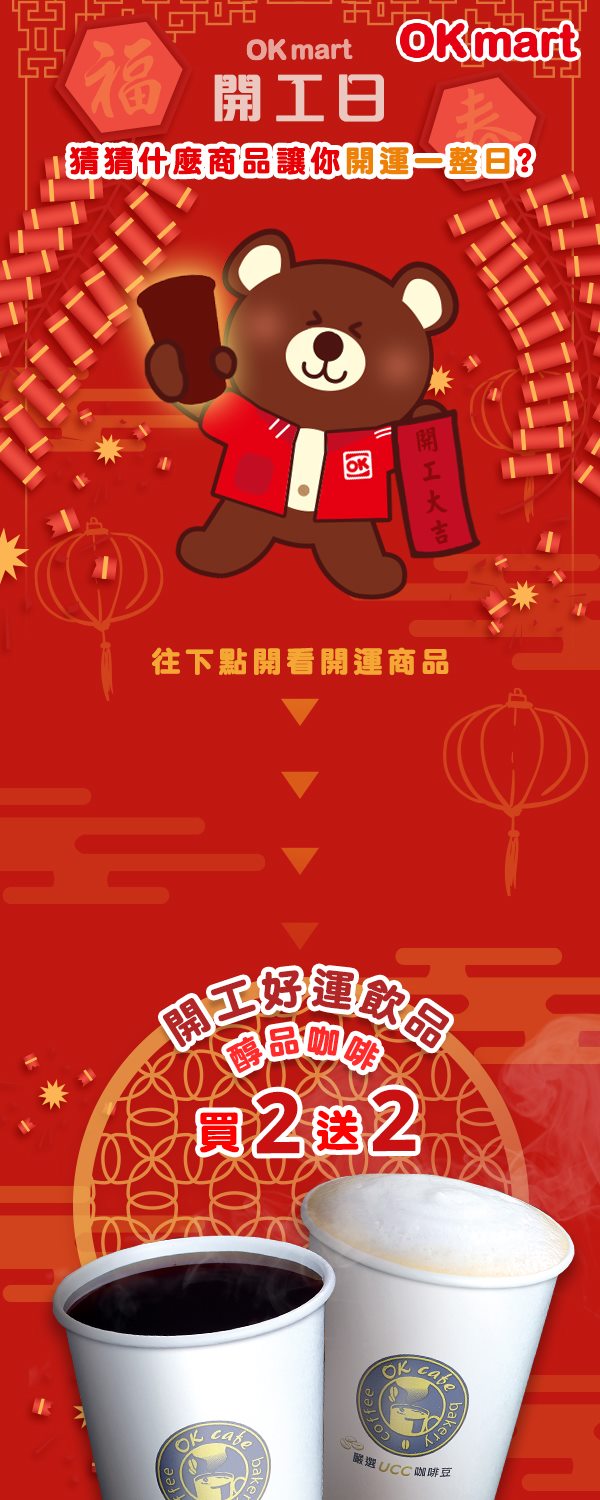 ▼OK-mart也推出開工好運飲品,即日起至2/12每周四、五醇品咖啡美式拿鐵買2送2,讓你開工提神不疲憊,今天開始就揪同事一人一杯開工壓壓驚!