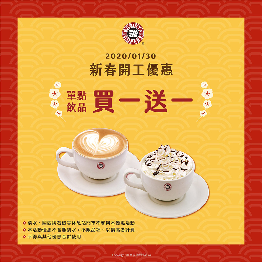 ▼開工不憂愁!西雅圖為您加油,於開工日祭出「飲品買一送一」優惠,快來杯濃郁香的咖啡吧!