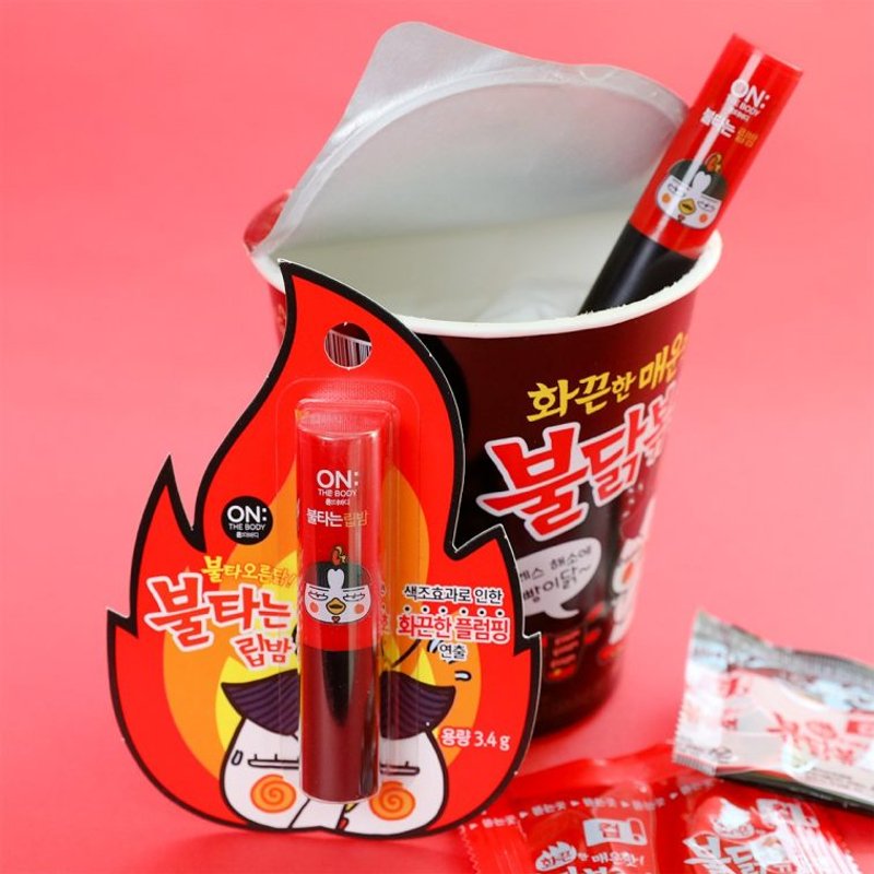 ▼三養辣雞麵跟美妝品牌ON THE BODY聯手,推出了一款辣雞麵潤唇膏。它的包裝借鑒了辣雞麵的設計,內部的潤唇膏也是鮮豔的紅色,而且本身還帶有辣味。
