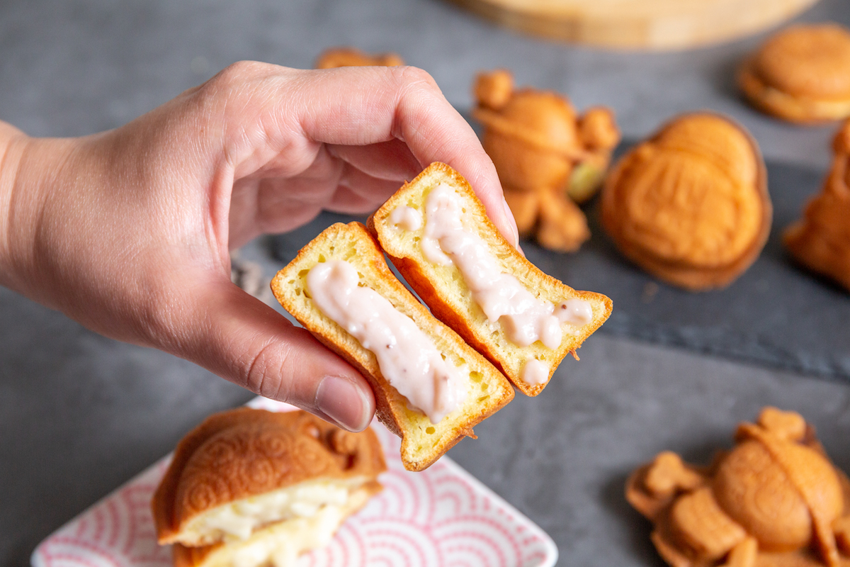 ▼海賊燒共有香草口味,以及季節限定的草莓口味,香濃內餡不論是冷凍起來像冰淇淋雞蛋糕、或是微波加熱後會整個流漿+噴餡的口感,吃起來都超療癒!