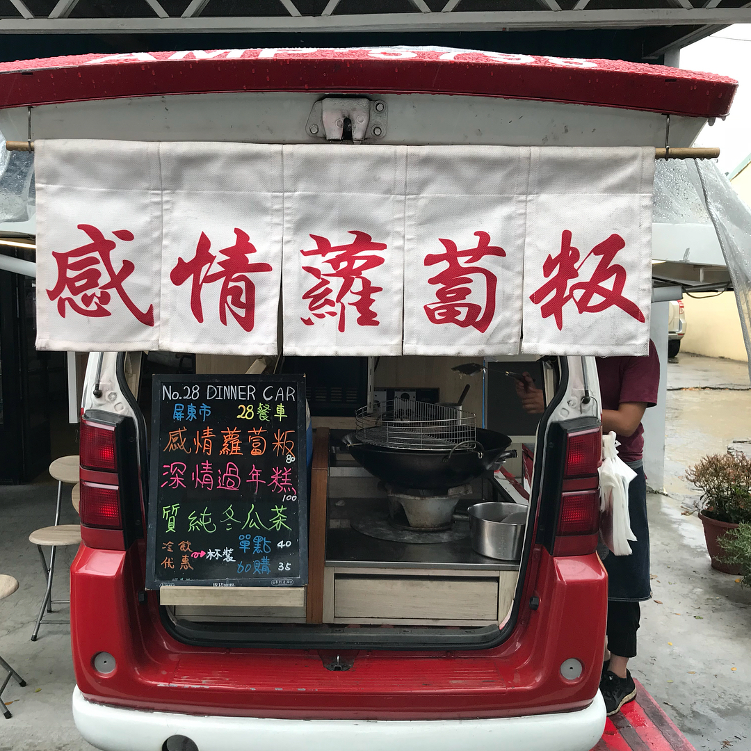 ▼「28餐車」在嘉、南、高、屏等地不定點不定時販賣,招牌人氣商品「感情蘿蔔粄」把外婆家傳的蘿蔔絲餅加以改良創新,在油鍋中上色至金黃,麵衣裹著絲絲清甜蘿蔔,還帶有淡淡蔥的香氣,撒點胡椒鹽就非常好吃。