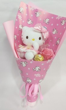 ▼「Kitty愛戀香皂花束」售價 399元,人氣Hello Kitty可愛玩偶花束,搭配金莎及手工香皂花,平價好入手送禮大方。