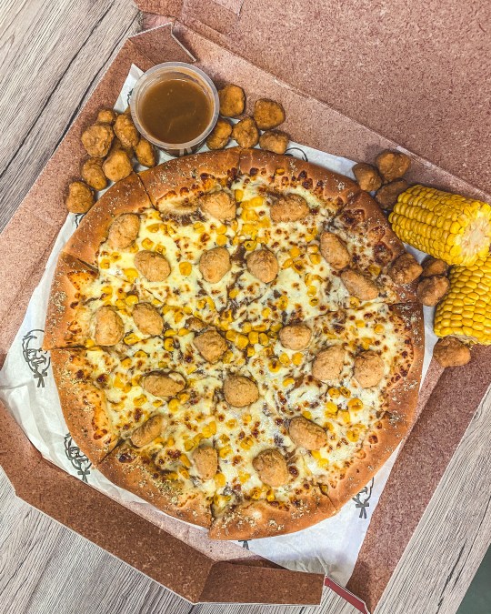 ▼你能想到的美味都能在這款披薩上找到,比如起司酥脆麵皮、肯德基的獨家肉汁醬、雞米花、甜玉米、莫札瑞拉起司、蒜末等等。
