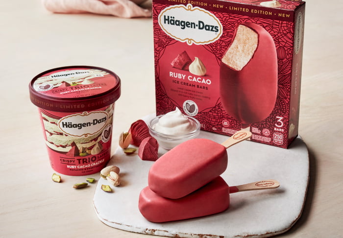 現在哈根達斯的紅寶石巧克力系列新品已經在美國上架,銷售到9月。紅寶石巧克力開心果甜奶油脆三層和紅寶石巧克力雪糕能在超商買到;哈根達斯的門店中有紅寶石巧克力聖代、蘸醬巧克力棒和甜筒。甜點控們一定要吃吃看啊~