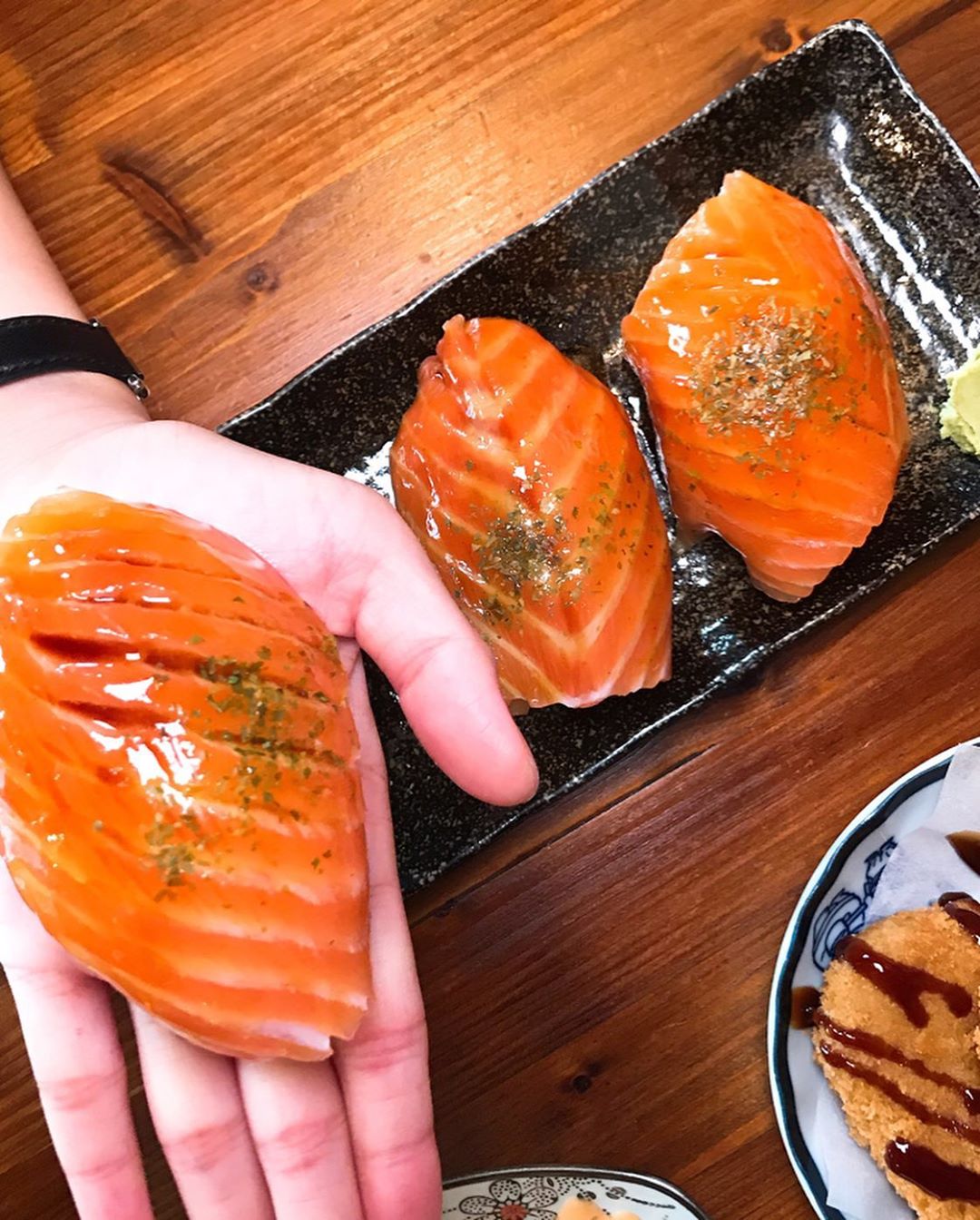 ▼這塊可不是鮭魚排,而是超巨超厚實的握壽司啦~整塊鮭魚肉豪邁地覆蓋在壽司飯上,包到幾乎快看不到飯了!