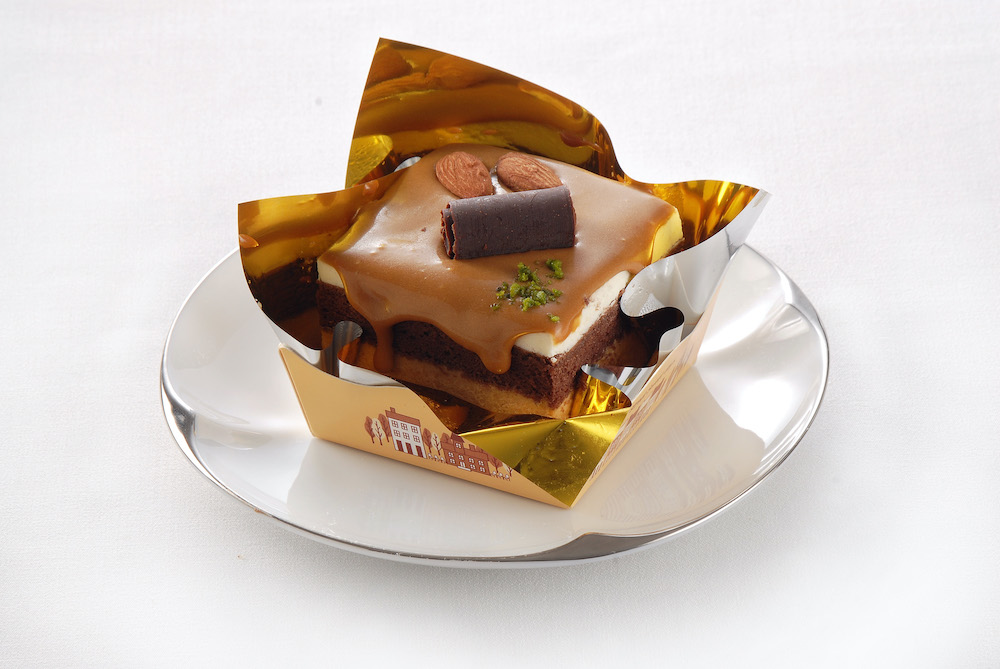 ▼「門市限定-焦糖慕斯」售價79元,濃郁的焦糖香氣盈口卻不甜膩,由爽口的椰子慕斯、巧克力蛋糕和焦糖慕斯堆疊出層次的豐富變化與綿密口感,是熟客入店必點商品之一。