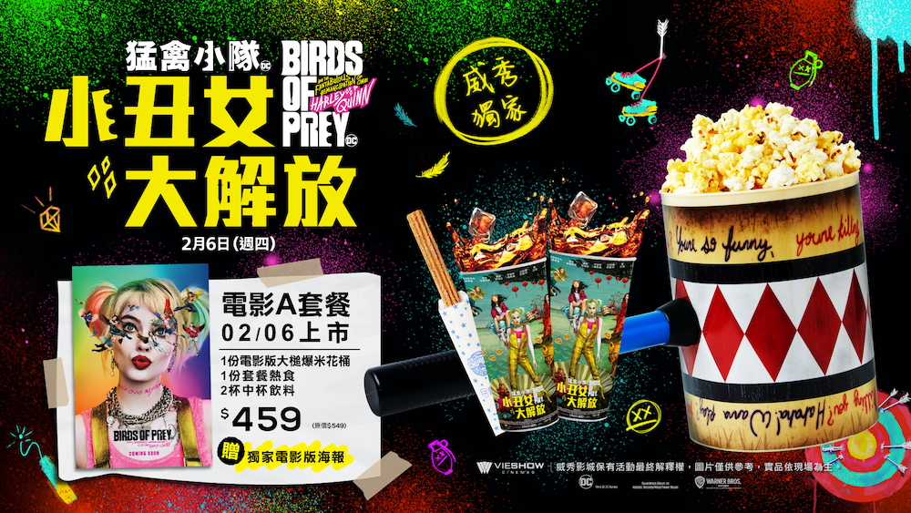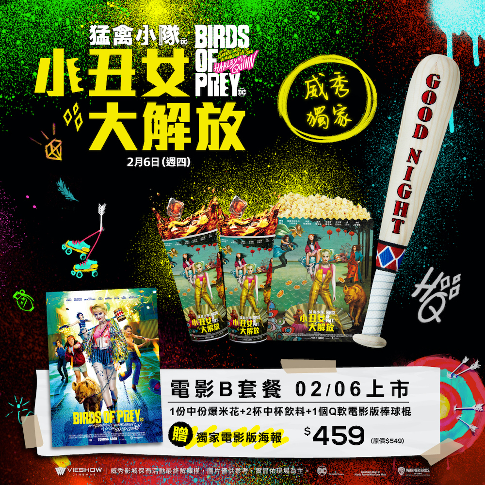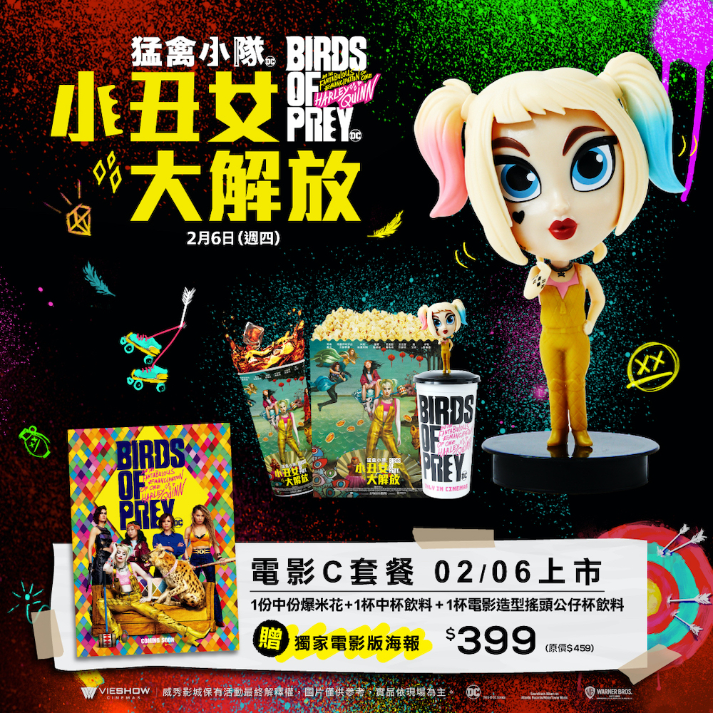 ▼電影《猛禽小隊》總算於2/6(四)登場!威秀影城同步推出「電影版大槌米花桶」、「Q軟棒球棍」以及「Q版搖頭公仔」,隨餐再贈獨家電影海報,系列套餐一齊上市,粉絲們千萬不要錯過!