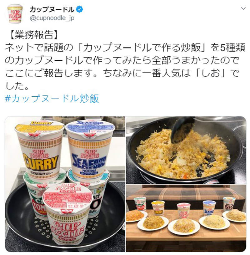 2020年02月18日最近日本網路上出現了一種討論度極高的料理:杯麵炒飯(カップヌードル炒飯)。這是一位推主分享的自製創意料理,他將日清杯麵捏碎後加入炒飯裡,吃起來很美味。網友們模仿後也很認可這種料理的口味,認為杯麵的調味料跟口感能讓炒飯更美味。沒想到這件事竟然引起了日清官方的重視。