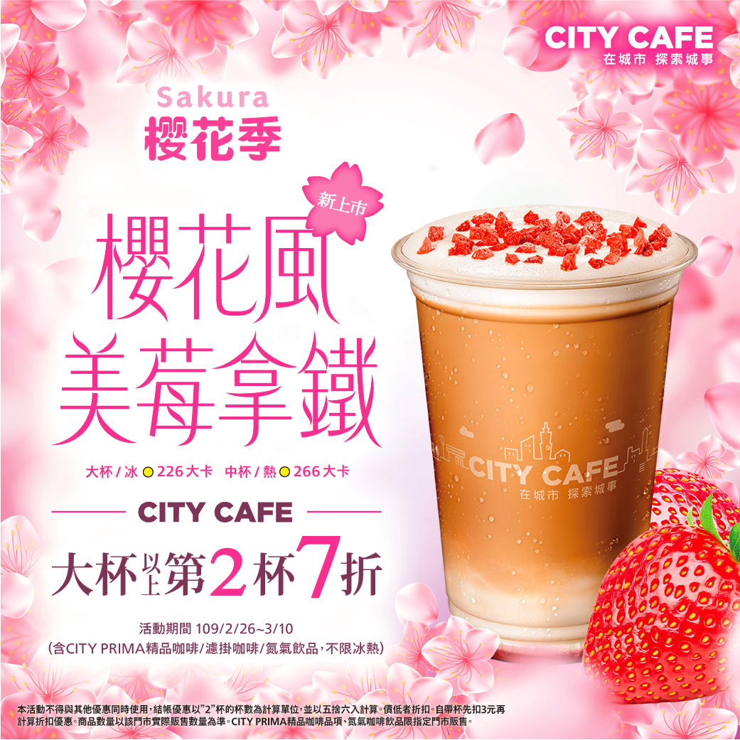 ▼櫻花風美莓拿鐵全國限量30萬杯,另外從2月26日起至3月10日,一次購買2杯CITY系列飲品大杯以上 (不含Espresso),任選第2杯7折!