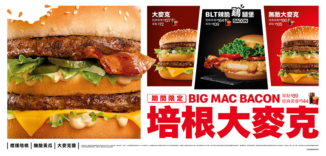 「培根大麥克」:2020年2月26日起至2020年3月24日止限期供應或售完為止,單點89元、經典套餐144元。