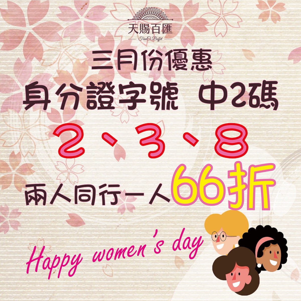 ▼這次因應38婦女節,天賜百匯又推出感恩婦女活動,即日起至3月底凡身分證字號中有「2、3、8」中2碼者,2人同行可享1人66折;而且雖然是婦女節活動,但是男女都適用喔~