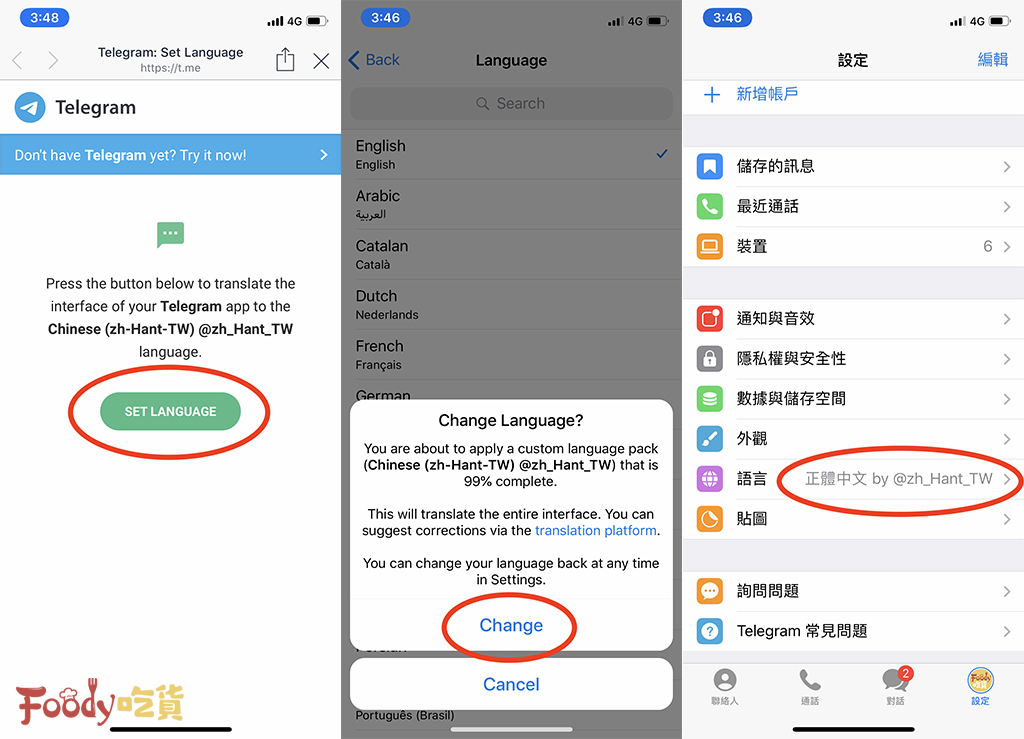 輸入驗證碼之後,會直接跳到Telegram介面,到這邊就完成70%囉!接下來會看到整個介面都是英文,只要按下這個連結「中文化連結」,點擊綠色按鍵「SET LANGUAGE」,在跳出來的視窗點擊「Change」,Telegram就會變成中文的囉!