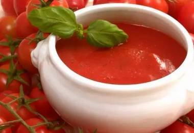 ▼番茄醬。洋蔥粒加入胡椒粉、鹽炒至金黃色,加入蒜末炒1分鐘。番茄丁、炒好的洋蔥、白砂糖、羅勒、旱芹放入開水中,大火煮開轉小火。熬製醬汁濃稠熄火,出鍋。自製番茄醬別有一番風味。