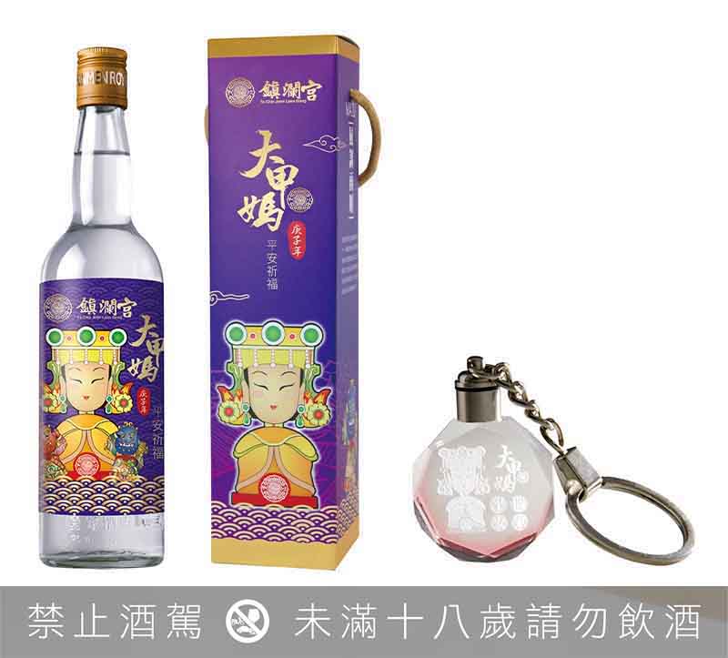 ▼此外,還有「大甲媽平安祈福酒」,嚴選純糧固態發酵58度高粱酒,大甲鎮瀾宮授權使用之Q版媽祖肖像紀念酒。每瓶附贈有「過爐」的大甲媽祖七彩雷雕鑰匙圈,帶在身上有保庇。