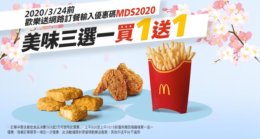 2020年03月06日麥當勞每次活動都很有誠意,前一波開春活動才剛結束,又馬不停蹄同步推出「美味三選一」活動,只要於網路訂購麥當勞時輸入序號「MDS2020」,就能享有「薯條(大)、4塊麥克鷄塊、勁辣香鷄翅」任選一樣同品項買一送一,然後就等熱騰騰的餐點上門囉!