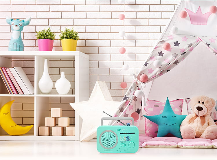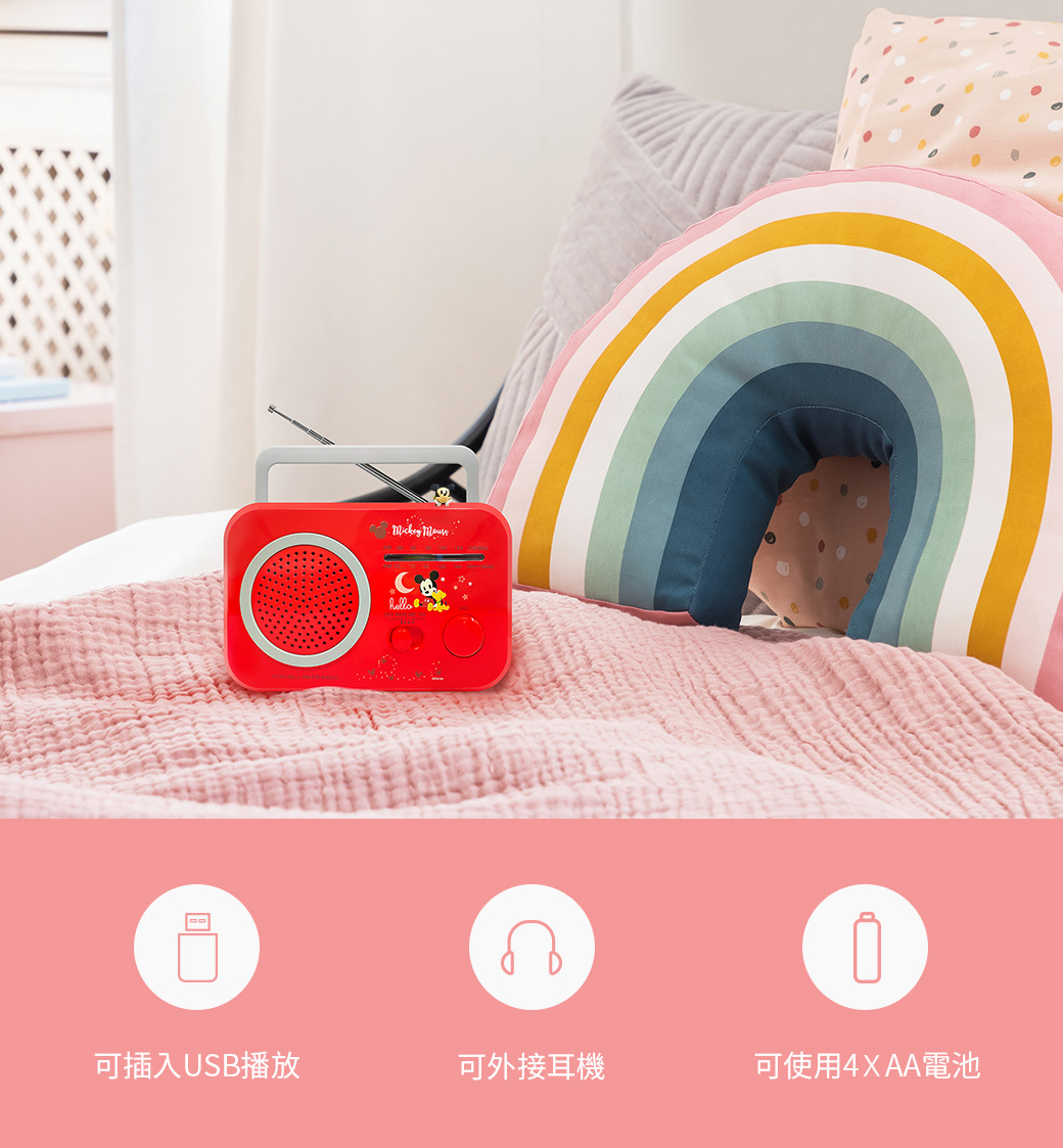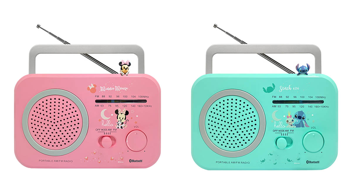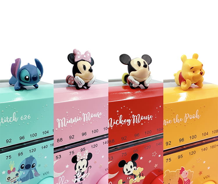 ▼這組藍牙音響非常有質感,糖果色的外觀上,還有著托腮的迪士尼角色小公仔,迷你尺寸很適合放在床頭聆聽音樂,還可以收聽AM/FM的電台喔!