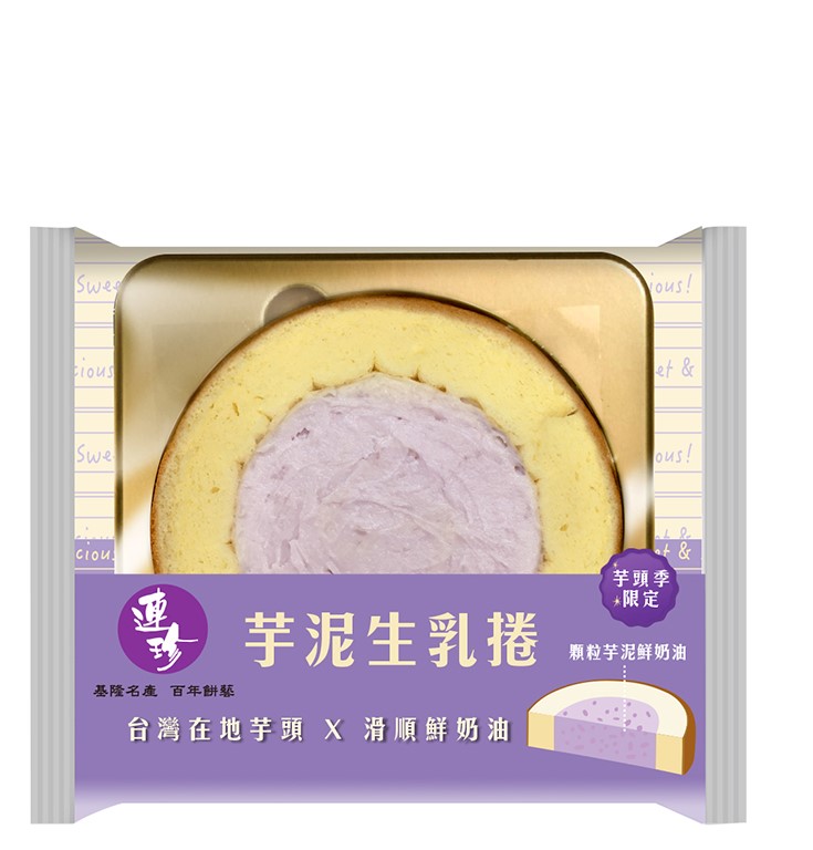 ▼芋泥生乳捲:芋頭餡使用台灣在地檳榔心芋頭,芋泥餡拌入紐西蘭鮮奶油,口感滑順又香甜。