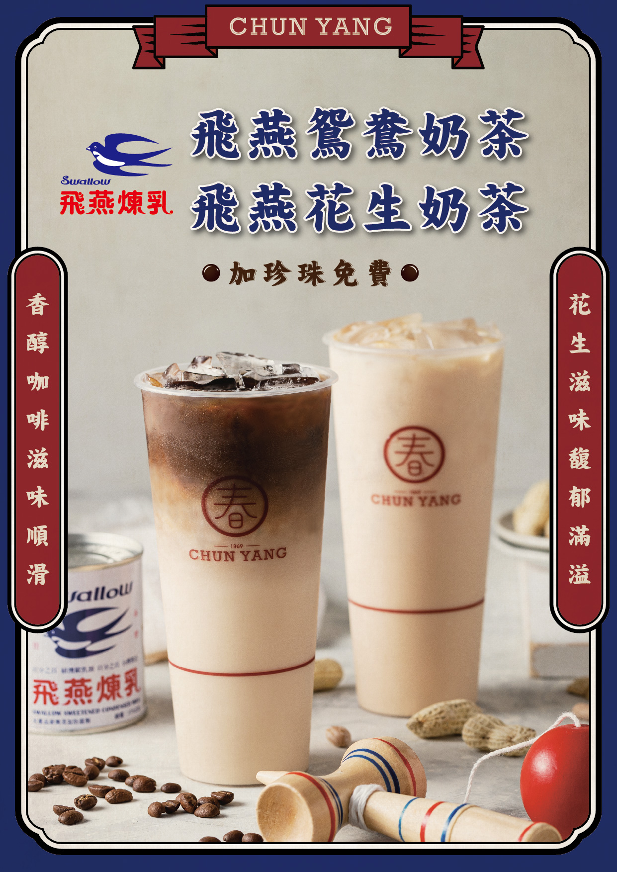 2020年03月11日召集奶茶控!春陽茶事與五十年老字號的《飛燕煉乳》攜手合作,推出「飛燕鴛鴦奶茶」與「飛燕花生奶茶」兩款期間限定飲品,經典的絕美滋味將重新復刻,身為奶茶控絕對不能錯過最純粹香甜的好滋味!