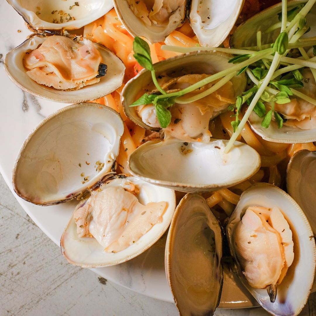 ▼超大蛤蜊的貝柱大得幾乎像干貝一樣,目測大概比一般蛤蜊大了5倍,一口咬下蛤蜊湯汁超級多又非常飽滿,只能說這個海鮮的甜味很可以!再搭上義大利麵一起享用,真的超級有飽足感,這麼狂的超大蛤蜊絕對不能錯過!