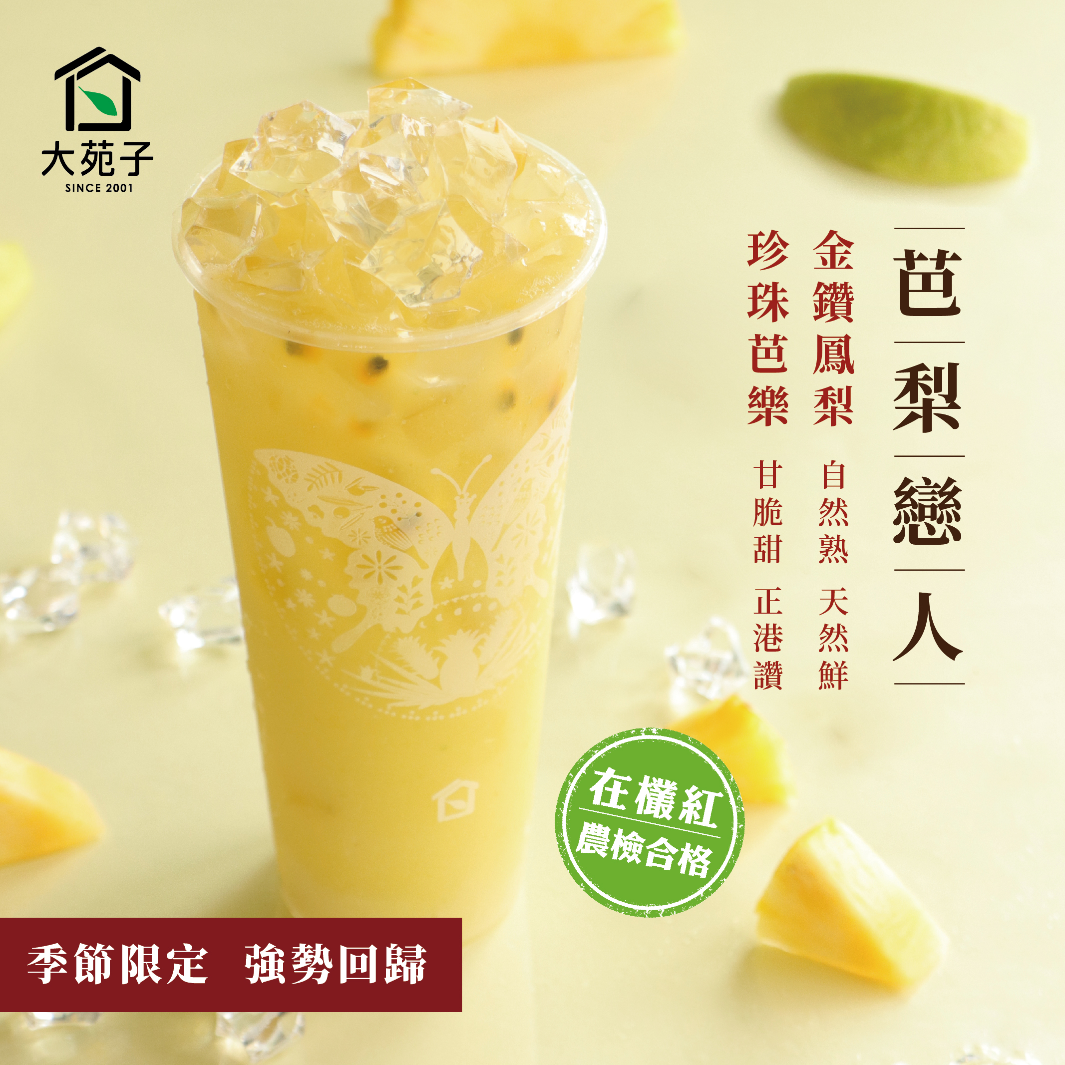 ▼另一支則是深受許多消費者喜愛的『芭梨戀人』,高調艷麗的台農17號鮮鳳梨配上低調順口的芭樂,完美組合再度強勢回歸。喜愛鳳梨的你千萬不能錯過大苑子這季的鳳梨飲品,絕對讓你無法忘懷!