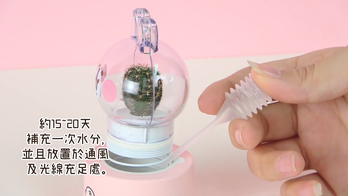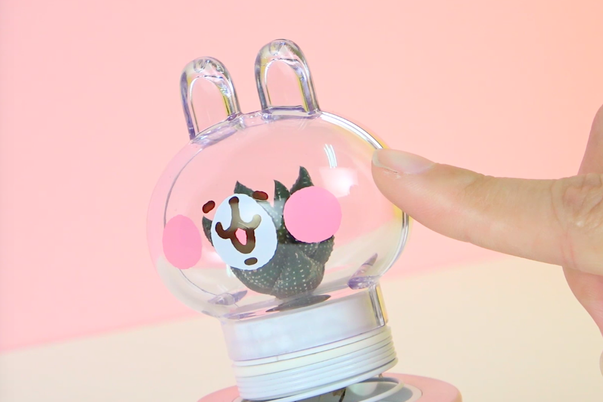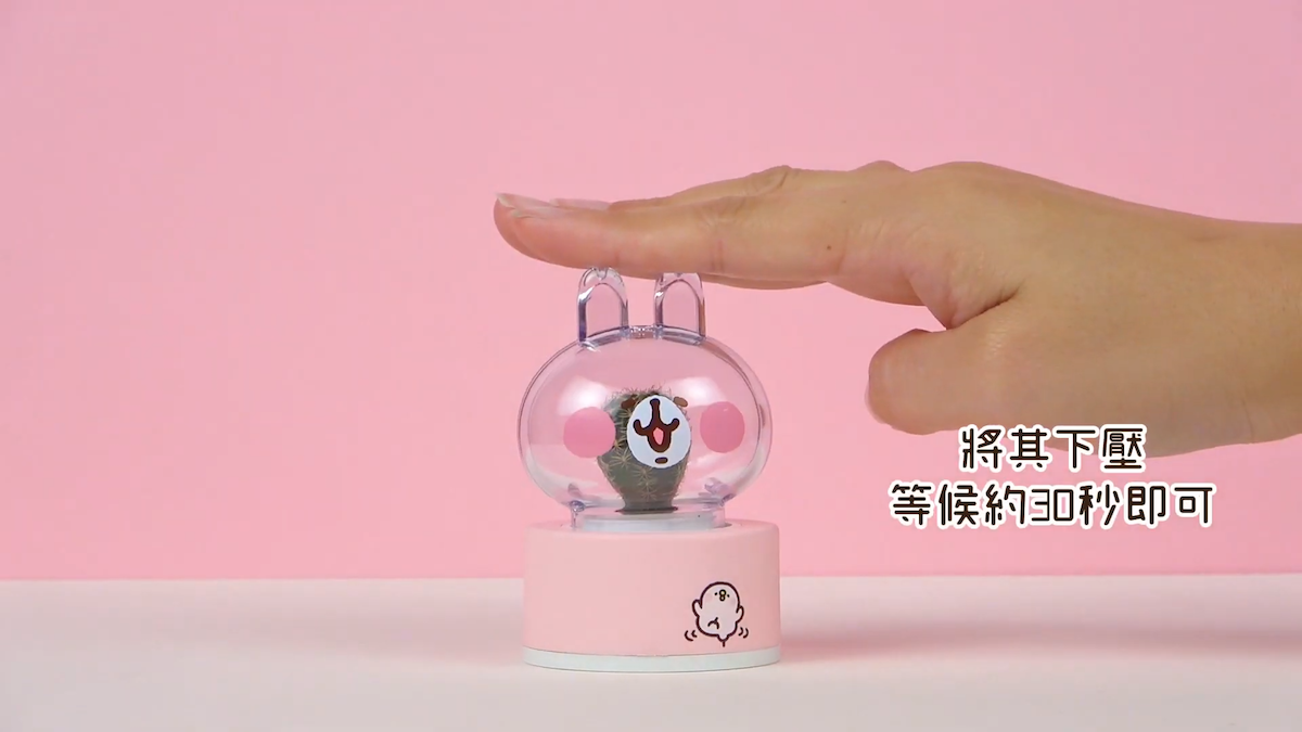 ▼多肉植物分為九輪塔、金剛丸、虹光丸3種(隨機出貨),加水後只要「按壓兔頭」30秒,每15-20天補充一次水分就夠了,照顧起來非常容易;而粉紅兔兔的搖頭公仔頭罩也可以拿下來更換不同植物。