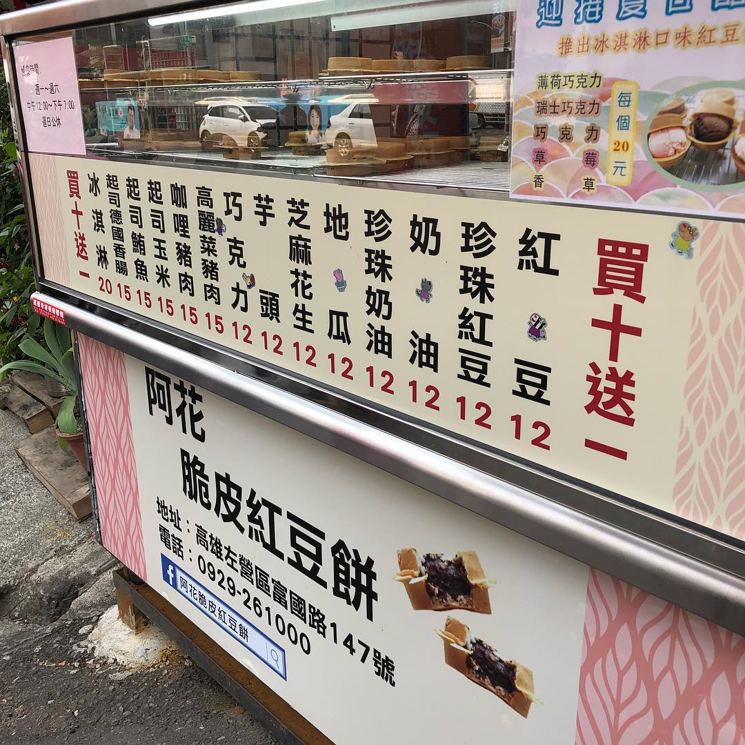 ▼阿花脆皮紅豆餅的招牌並不醒目,每顆紅豆餅售價大概在於12到20元之間,但是口味卻十分特別!定番包括奶油、紅豆,甜的還有地瓜、芝麻花生,鹹食則有高麗菜豬肉、咖哩豬、德國香腸,讓人每種都想吃吃看!