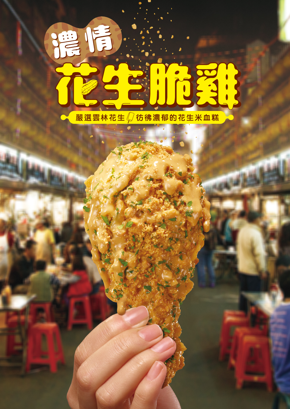 ▼肯德基以記憶中的夜市米血糕經典調味結合美式脆雞,創造醇香濃烈的「濃情花生脆雞」,以鹹香純粹的花生醬搭配特選雲林在地台南十一號花生製成的花生粉及花生角,不僅帶來濃郁的香氣,更提供多層次口感。
