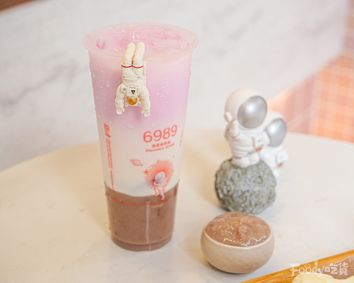 ▼「6989 恆星系手搖飲」距離機捷林口長庚醫院站,步行只要五分鐘就能抵達,整間店面以粉色調為基底,加上可愛的霓虹Logo字樣,以及隨處可見的太空人公仔扭蛋,就像來自外太空的夢幻粉色星球,不管從什麼角度拍都超可愛!