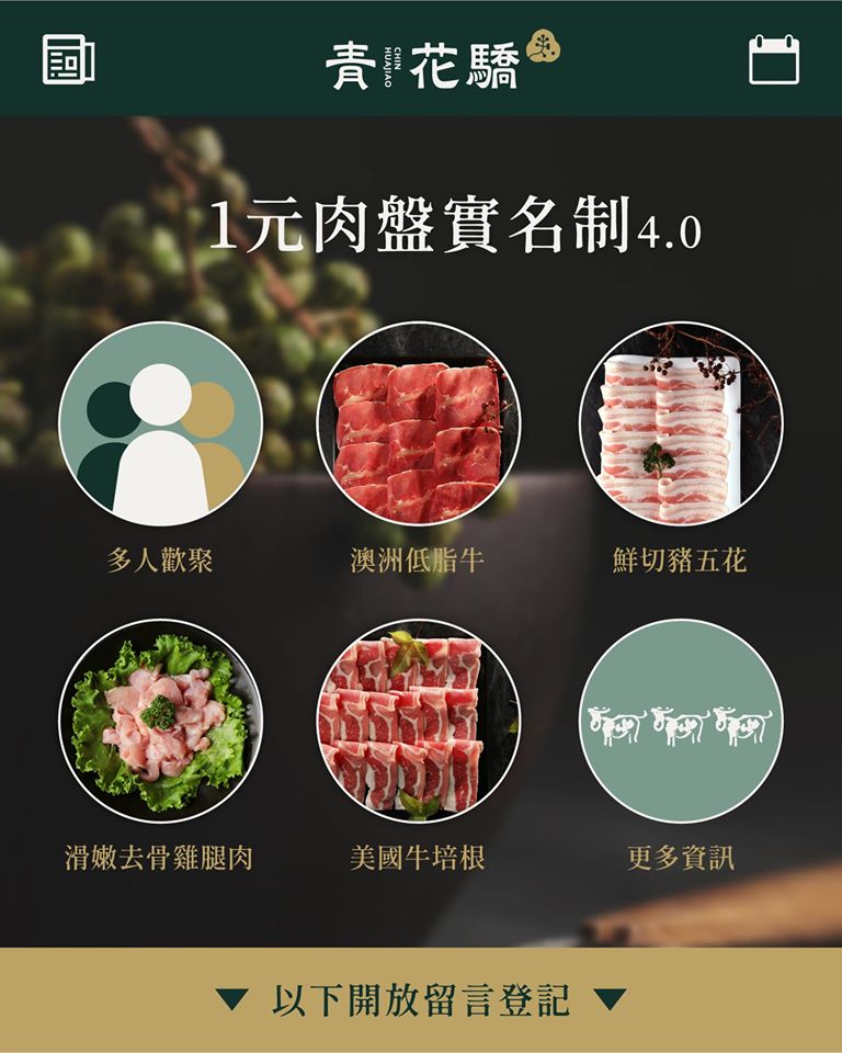 2020年04月10日肉肉控快看!人氣麻辣鍋「青花驕」寵粉無極限,即日起推出1元吃肉肉的「饗肉卡」,只要完成實名制登記,即可享指定肉盤1元,肉品包含美國牛培根、鮮切豬五花、滑嫩去骨雞腿肉和澳洲低脂牛可以做挑選,這麼佛的活動絕對不能錯過啊~