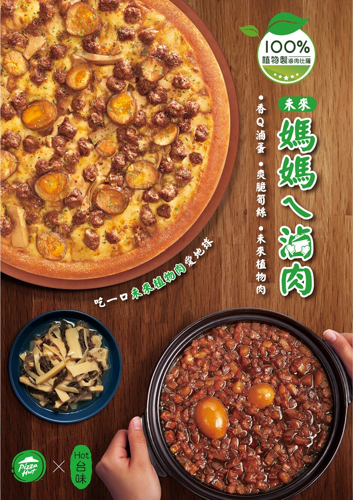 ▼隨著消費者飲食習慣的轉變,植物肉逐漸成為未來飲食新趨勢,看準此潮流,必勝客融合「Hot台味」概念,推出全新「未來媽媽ㄟ滷肉」比薩,再次以西式比薩與台式小吃的結合,以創新顛覆的食材,重新演繹記憶中媽媽的灶腳好手藝!