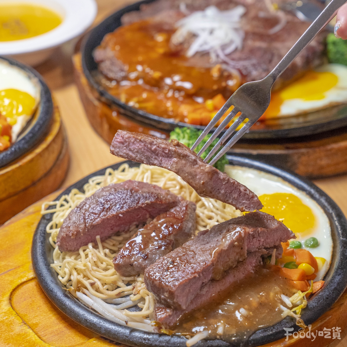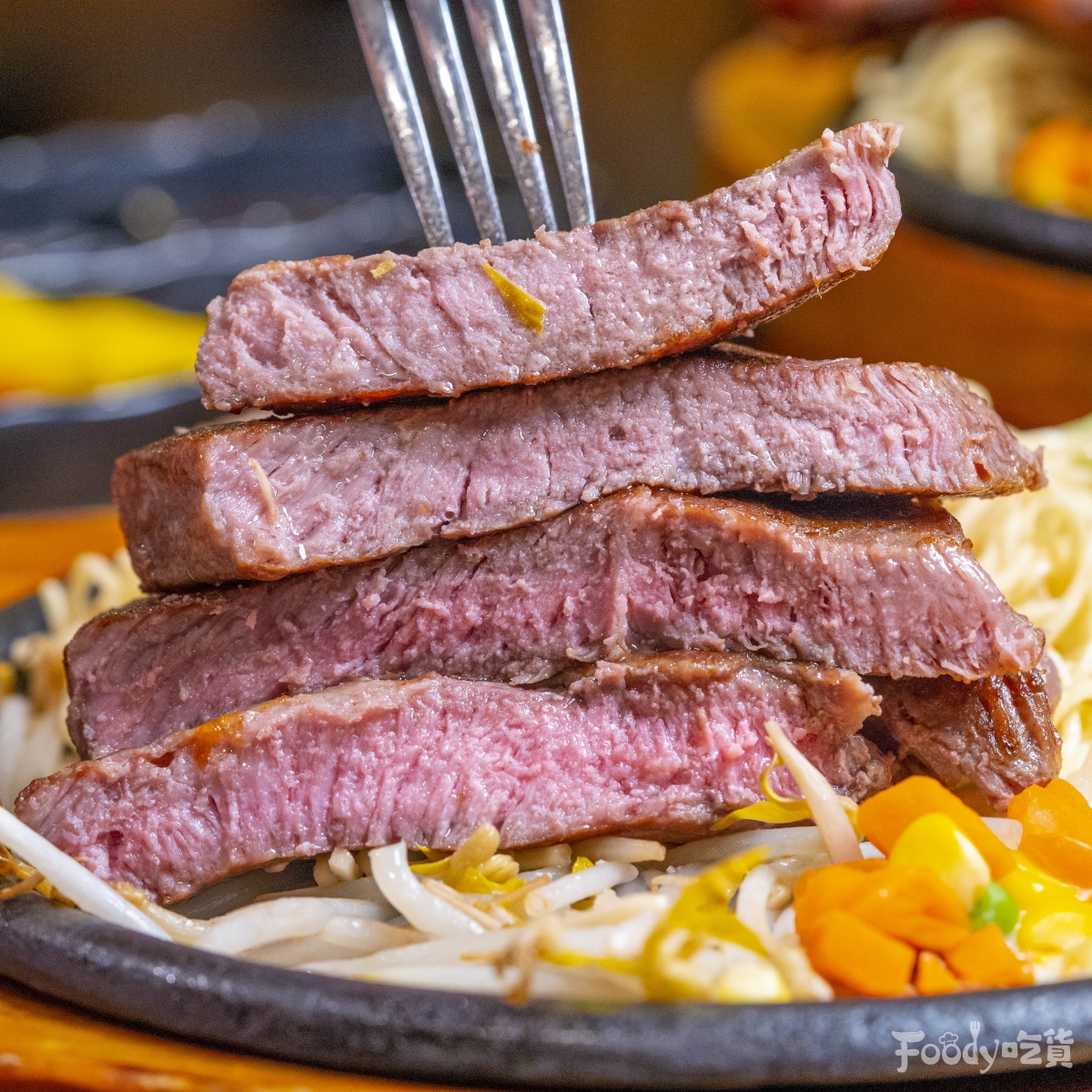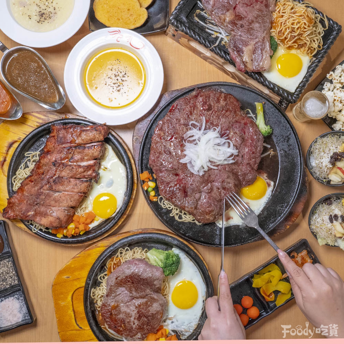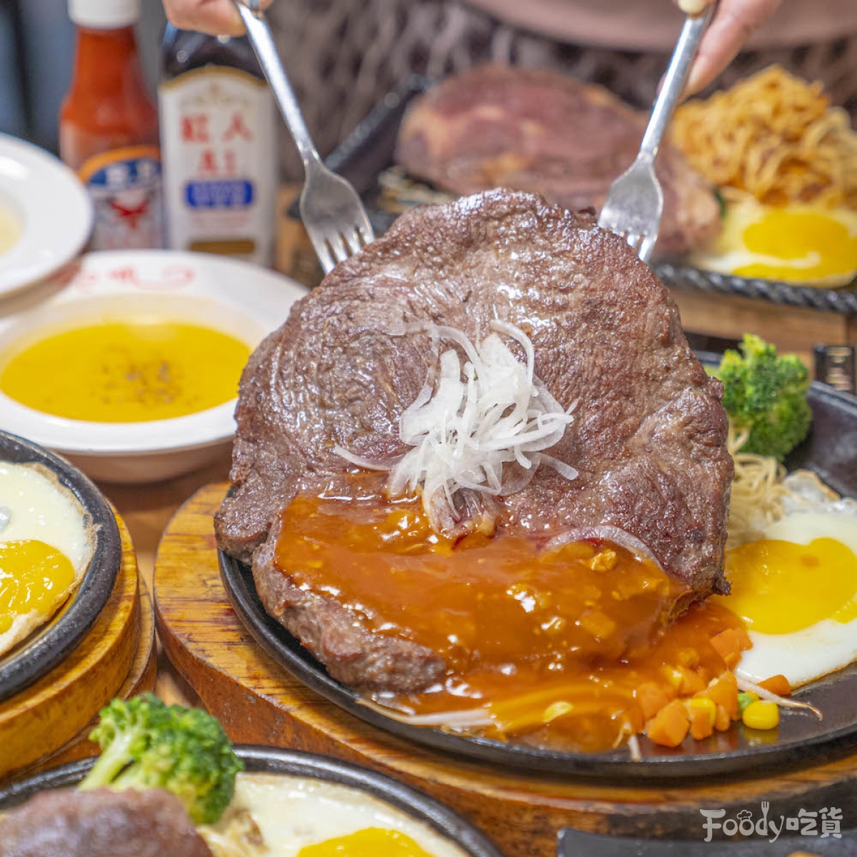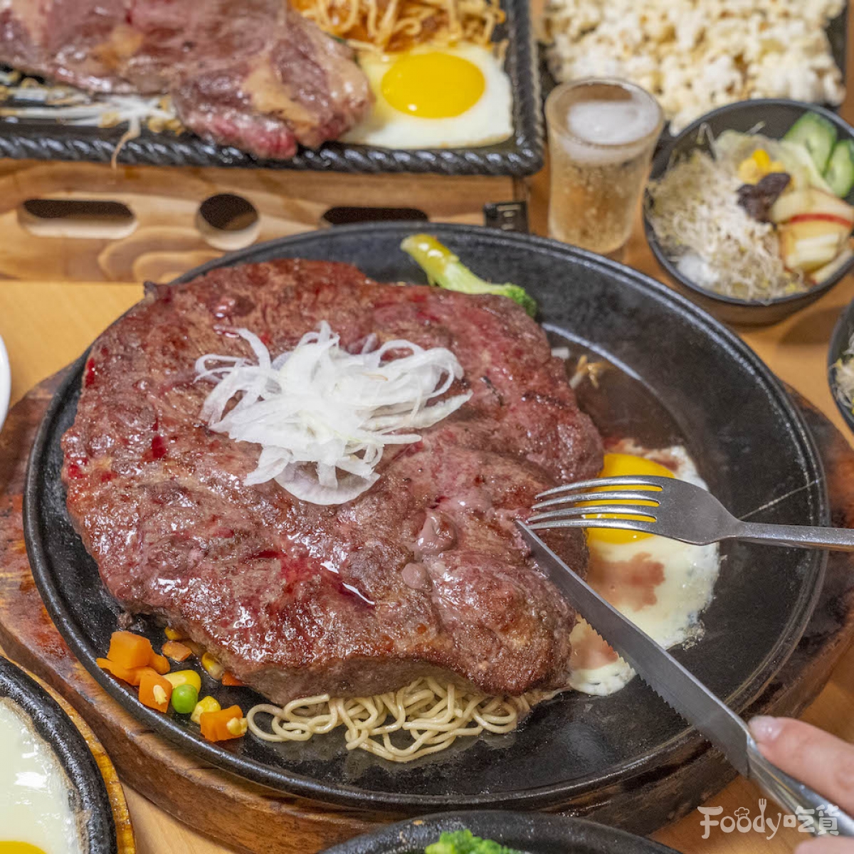 ▼除了大胃王專屬的大盎司牛排之外,店內還有人氣銷售第一的「嫩肩牛排(12oz)」、達人嚴選推薦「安格斯肋眼牛排(10oz)」等等,特別是安格斯牛排是使用美國穀飼牛,高級肉品等級的牛排肉質非常軟嫩,甚至吃三分熟都沒問題,不管是淋醬還是沾鹽吃都很夠味!搭配底下的鐵板麵和半熟蛋,飽足感不輸大盎司牛排!