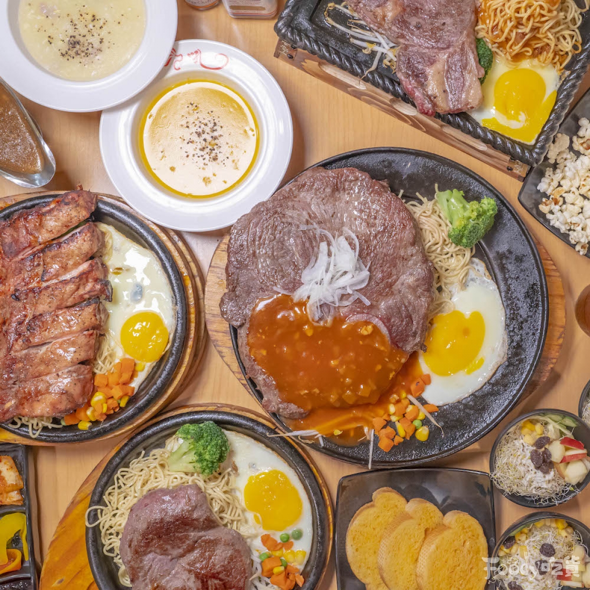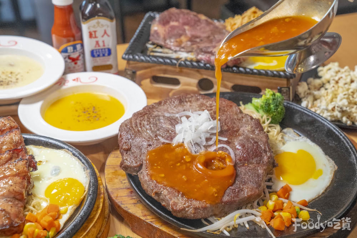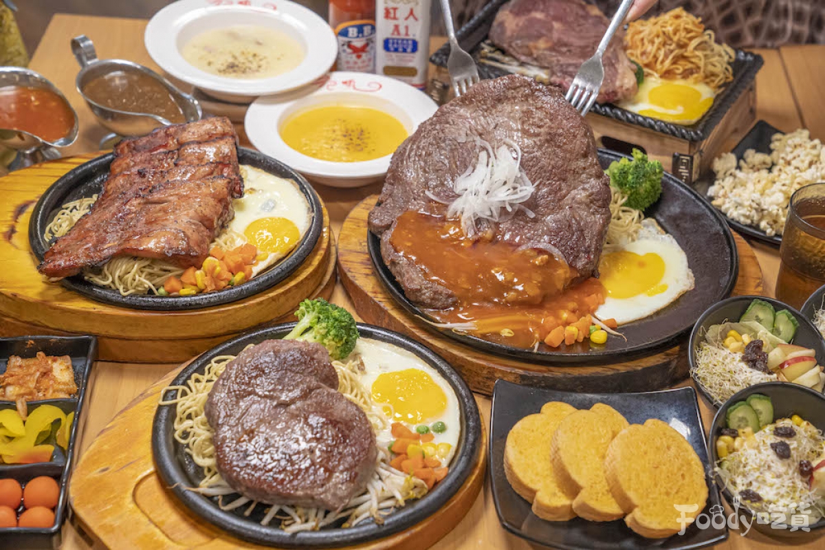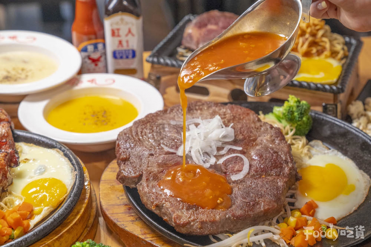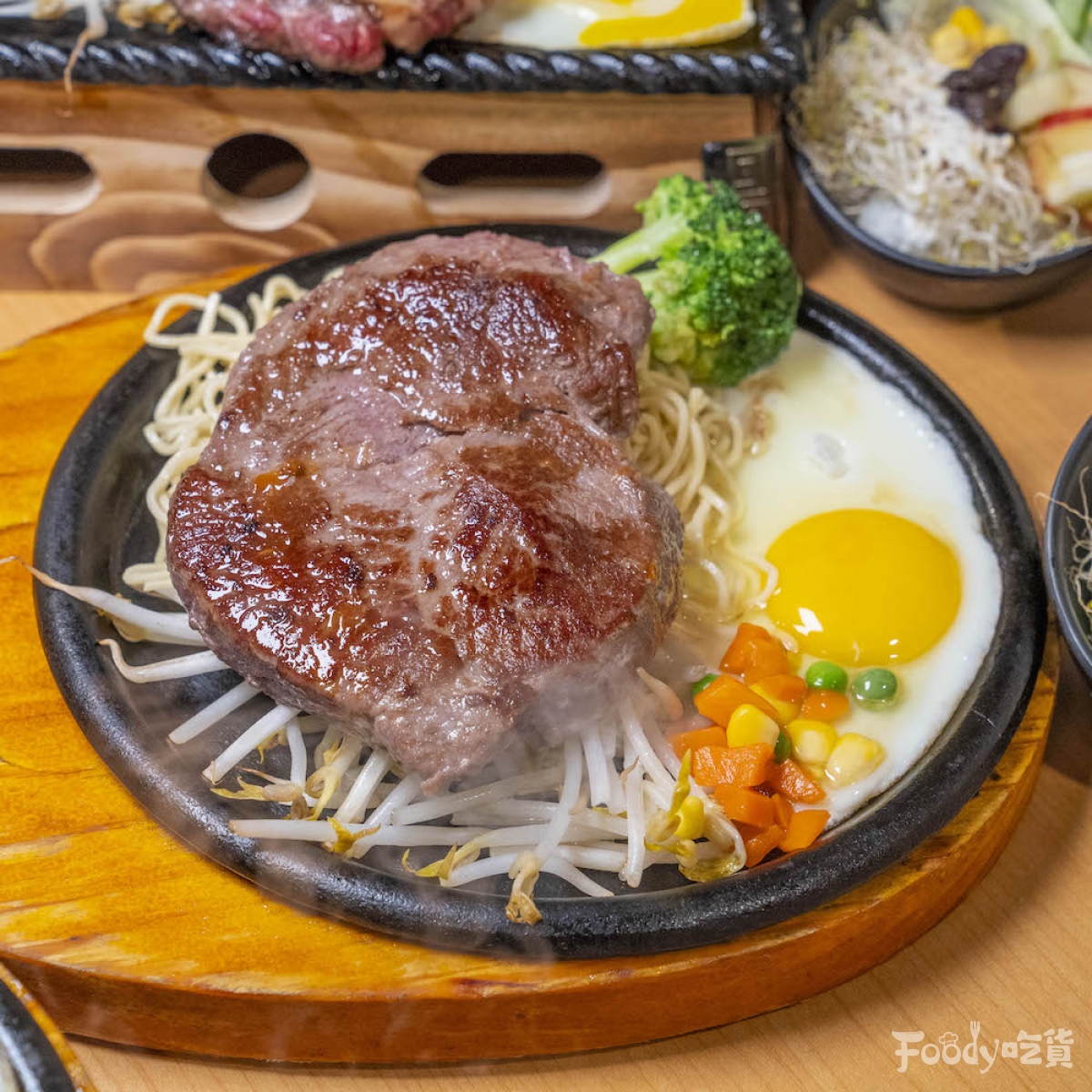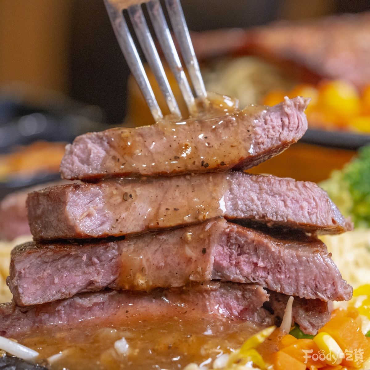 ▼除了大胃王專屬的大盎司牛排之外,店內還有人氣銷售第一的「嫩肩牛排(12oz)」、達人嚴選推薦「安格斯肋眼牛排(10oz)」等等,特別是安格斯牛排是使用美國穀飼牛,高級肉品等級的牛排肉質非常軟嫩,甚至吃三分熟都沒問題,不管是淋醬還是沾鹽吃都很夠味!搭配底下的鐵板麵和半熟蛋,飽足感不輸大盎司牛排!