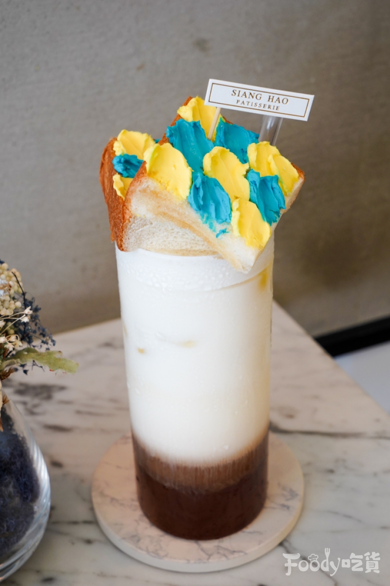▼另外店家還有推出和油畫乳酪盤一起搭配的「油畫拿鐵」($180),在紅茶拿鐵上加兩塊小吐司,吐司是雙色奶油乳酪,光是這個顏值就可以給他滿分了!