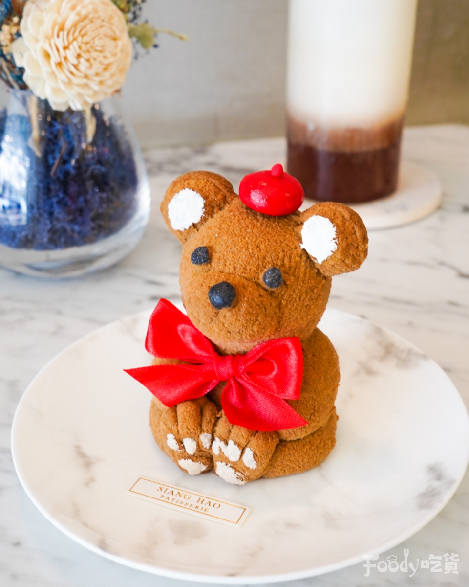 ▼「Siang Hao手作甜點」的招牌就是這隻可愛的小熊,這次店家特別幫小熊多了一個畫家帽,不要以為小熊只是普通的造型蛋糕,內餡是75%巧克力慕斯、榛果核桃餡、覆盆子果凍、伯爵慕斯以及巧克力脆片,沒想到一個小熊蛋糕,內層可以這麼豐盛!