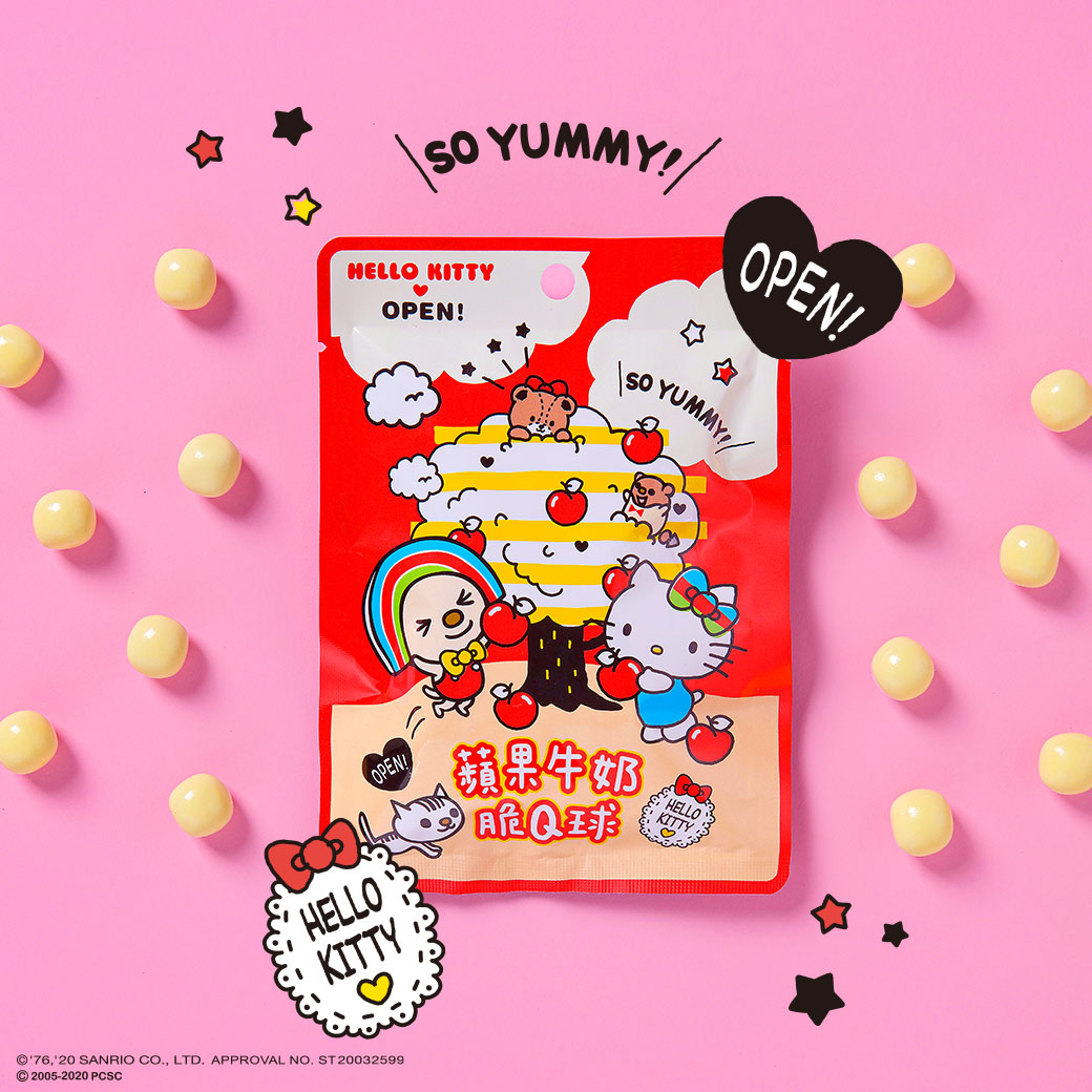 ▼「OPEN! x HELLO KITTY蘋果牛奶脆Q球」($49元),Q脆果香外皮,內餡奶香濃郁有嚼勁。