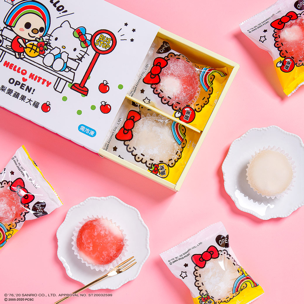 ▼「HELLO KITTY❤OPEN鳳梨愛蘋果大福」($280元),HELLO KITTY與OPEN小將聯名合作,視覺味覺雙療癒。 HELLO KITTY最愛吃的蘋果與綿密的慕斯餡結合,搭配吸睛Q嫩的淡粉麻糬皮。 OPEN小將最愛吃的鳳梨熬煮成鳳梨酥內餡,搭配慕斯及雪白麻糬皮。