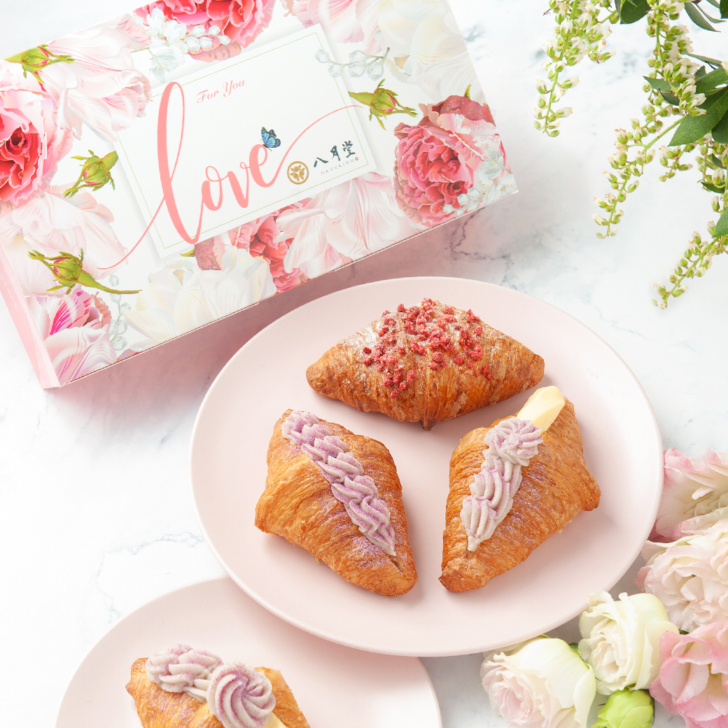 ▼另外,八月堂更特別推出訂製款「粉想寵愛妳-花綻」禮盒,分別是正櫃的「莓麗繽紛」、「紫薯芋泥」、「紫芋見愛」三種口味,以及快閃店的「伯爵奶茶」、「黃金流沙」、「青森蜜蘋果」口味,即日起至5/7期間預購花綻禮盒6入享85折