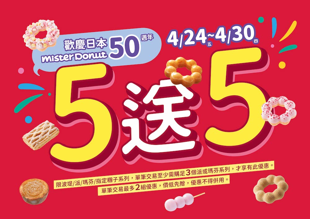2020年04月28日為慶祝日本Mister Donut 50週年,即日起台灣也特別推出甜甜圈快閃活動。至4月30日止凡購買指定品項,即可享指定甜甜圈與點心「買5送5」。七款波堤系列商品、日本進口酥派、綿密鬆軟瑪芬蛋糕、Q彈又夢幻的櫻花漾糰子,通通吃得到,甜甜圈控們還不快用新台幣下架!